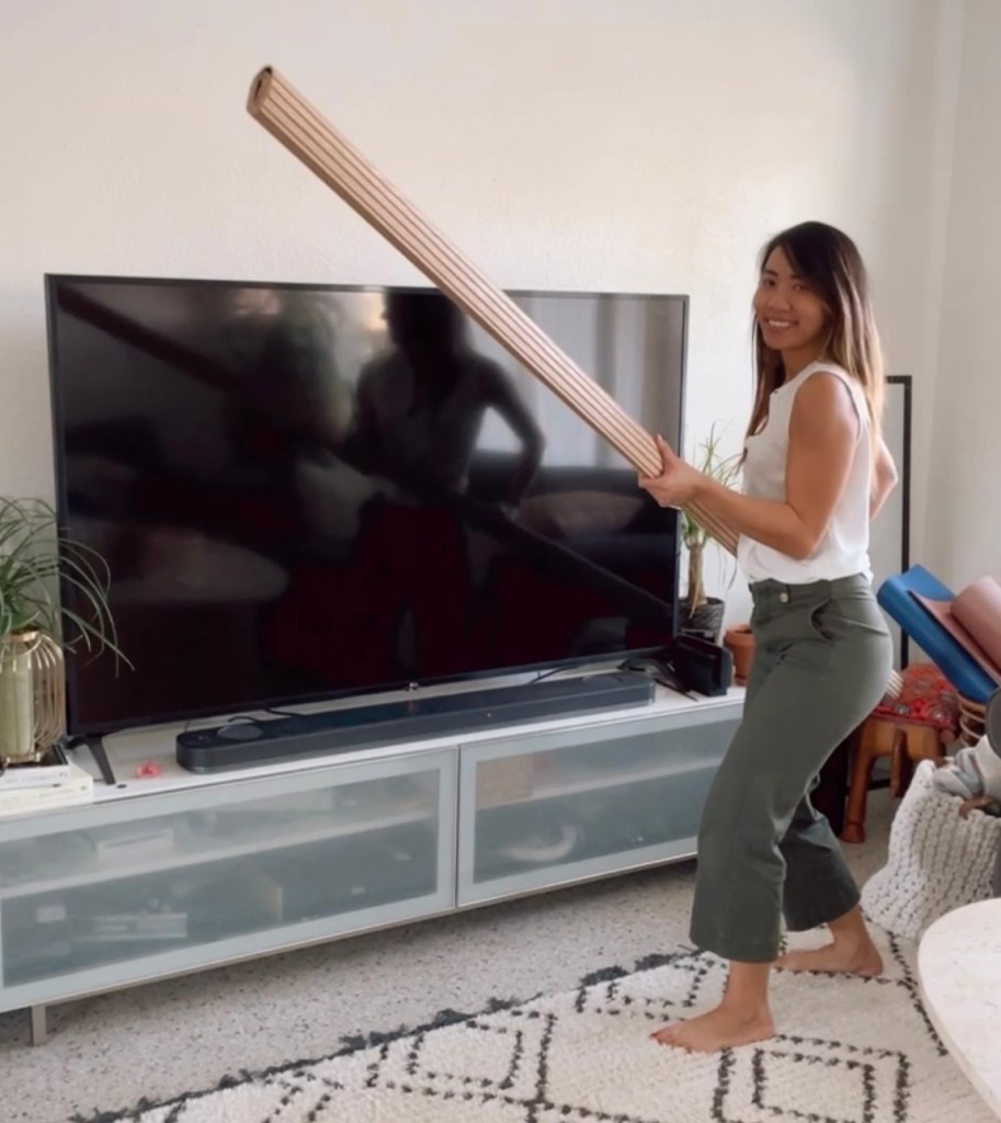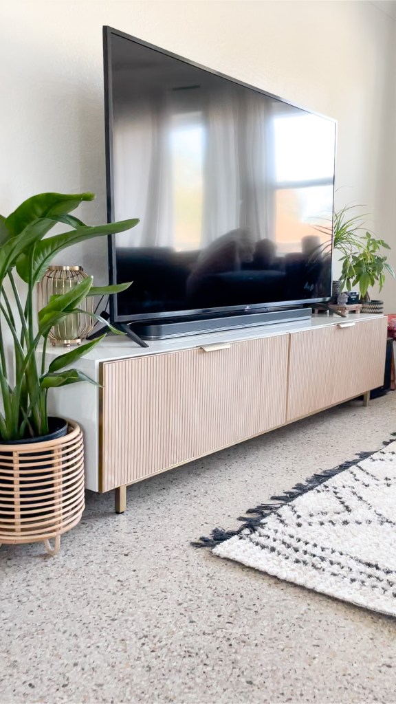 It worked out perfectly in my living room, except… it turned out to be a bit of an eyesore when you can see through the frosted glass! Rather than replacing it, I decided to give it a quick makeover. I knew I needed to just cover the glass part and thought through a few options. To keep with a boho or modern design, I looked at wood or rattan. Then I stumbled across a ton of pole wrap DIYs and knew THIS is the way to go. It was the EASIEST Fluted TV stand DIY and I can’t believe it turned out so good! It completely transformed the TV stand and made it look *expensive*!