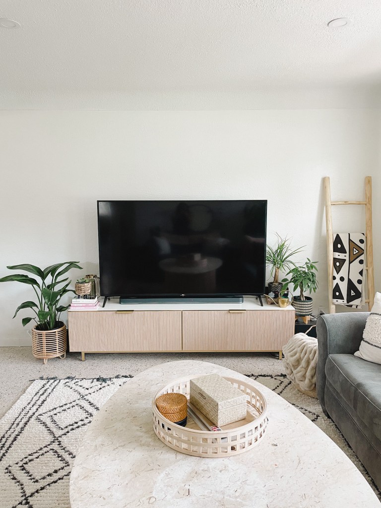 When we moved into our house, we had little furniture and definitely no TV stand. I had my eyes on the West Elm Quinn media console, but it was not in our budget! I needed something similar and turned to Facebook Marketplace. It’s a go-to of mine for finding inexpensive furniture. I ended up getting this IKEA console for $90!