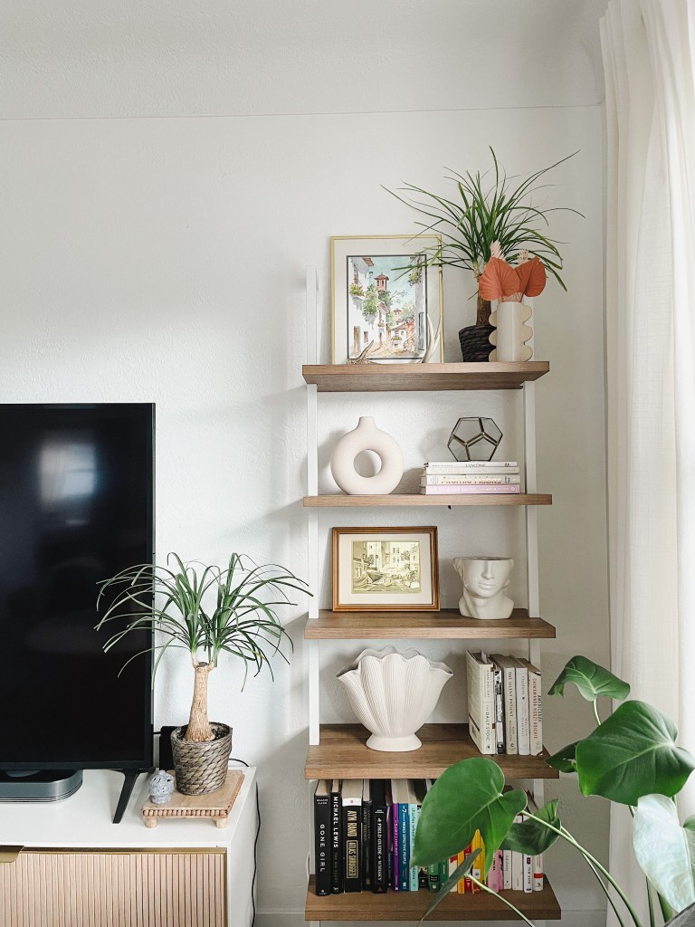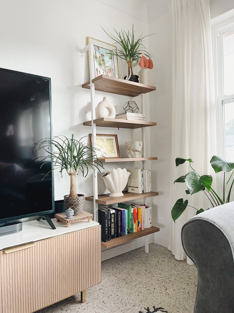 I added a new shelf to my living room and I’m loving how it looks in here! It only took 2 weeks of it sitting in our room and taking up space before installing it (HEHE oops!). It only took 30 minutes, so not sure why I dragged my feet on it. I had a ton of books filling up another bookshelf and the vases were just playing musical chairs with where they were put! 9 months into living here and things are just slowly finding their homes 🙂