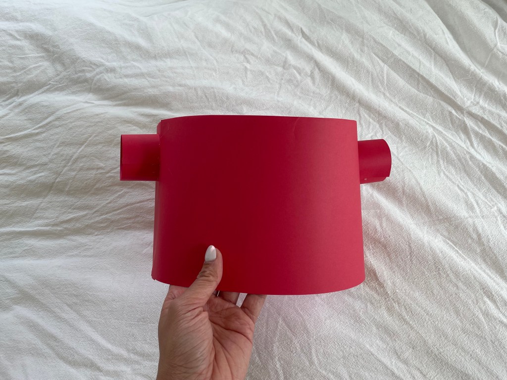 - For the hat (or Kikkoman cap), I cut out strips of red card stock (ensuring its long enough will fit over your head) I used 2 pieces of card stock and hot glued them together.