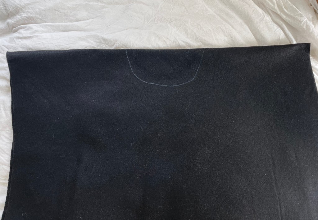 - Fold the fabric in half and cut a half circle shape, this is where you’ll stick your head through. I used chalk to trace the line to cut. I also slimmed down the fabric by cutting out around the arms.