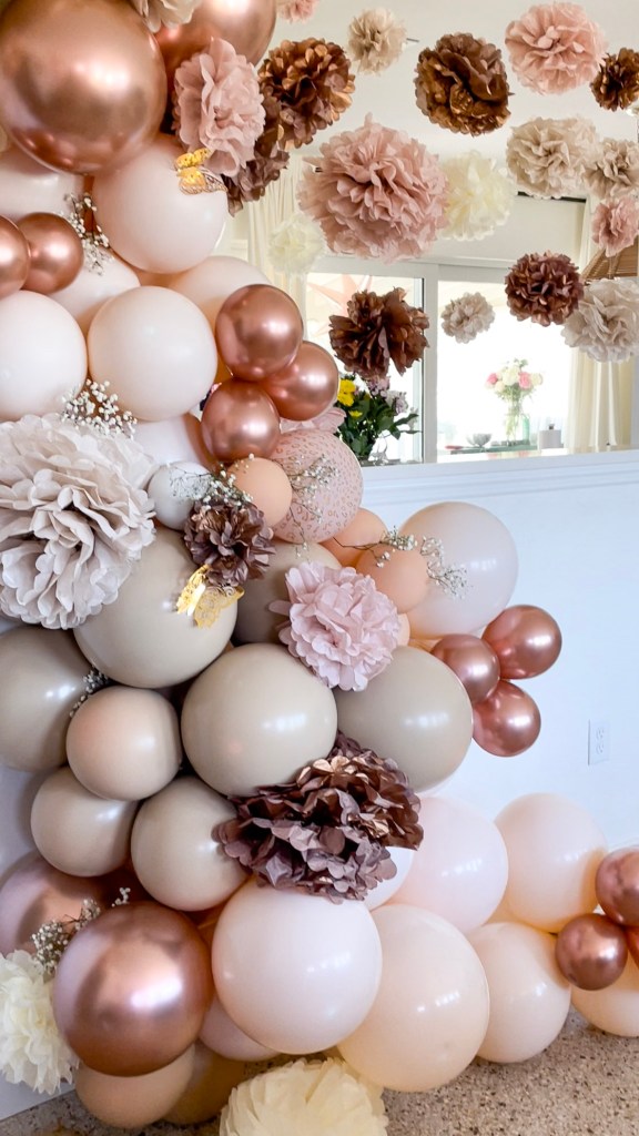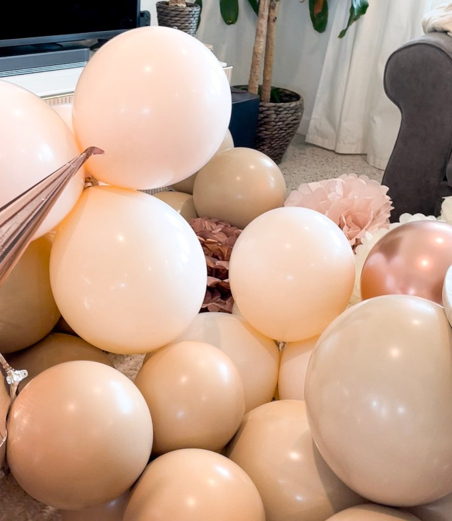 I’m not going to lie, it took the afternoon to complete with 4 people. The longest part of it was blowing up the balloons and making the paper poms. After that, assembling it went by quickly, so definitely plan ahead with enough time to prepare for your party. This also lasts a while too, we took it down after a week (it was just too pretty!) and the balloons didn’t deflate or pop!