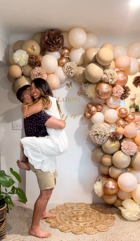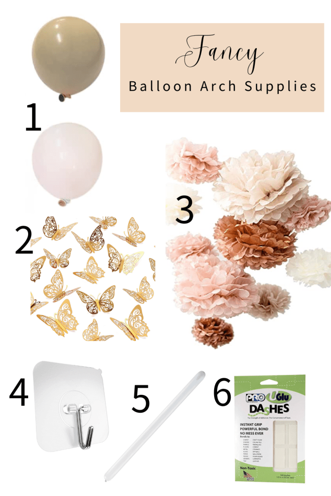 Using the tying balloon, tie the ends into a loop and hook it around a balloon cluster. This makes it easy to then attach it onto the hooks on the arch. Keep adding the balloon clusters until the arch is full. Then using the double sided tape, you can add on your filler items (gold butterflies, paper pom poms, baby’s breath, single balloons. etc.)