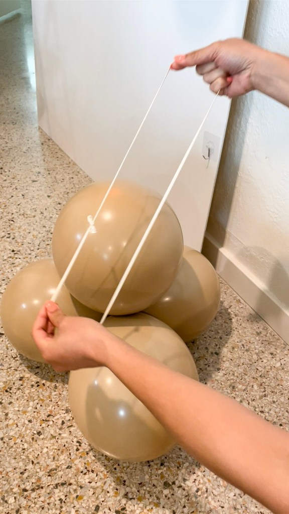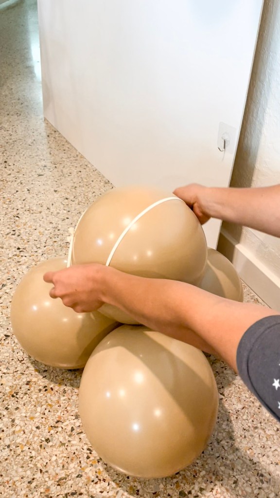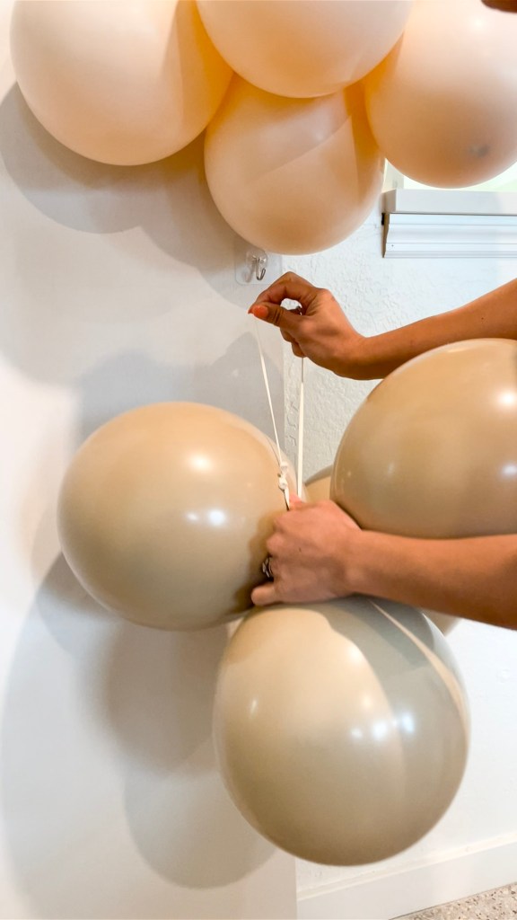 Then you’ll want to make balloon clusters (each cluster is made of 4 balloons) by taking 2 balloons and tying the ends together to make a pair. Then make another pair and take both pairs of balloons and cross them by the ends you tied. Twist them to hold and now you have a cluster! You can make them with various colors or like colors if you want to do a gradient.