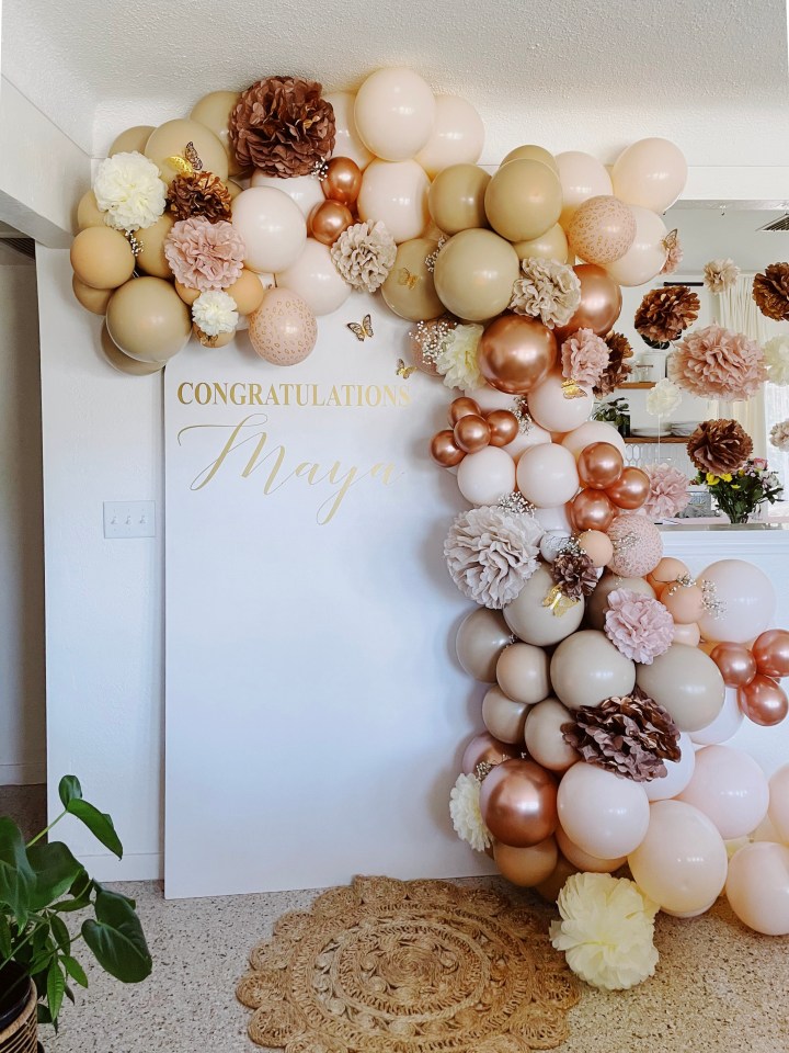 This balloon arch was a used as both a welcome sign and a backdrop for photos (hello Instagram!) for my niece’s pink boho party to celebrate her college graduation! A good mix of textures, colors and real flowers is what makes this look full and fancy.