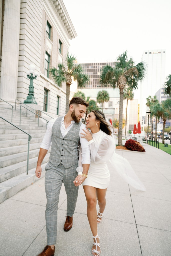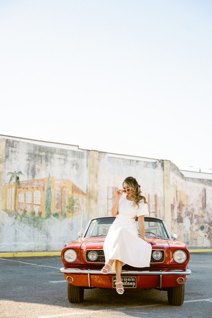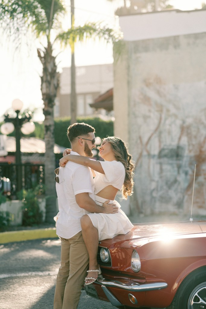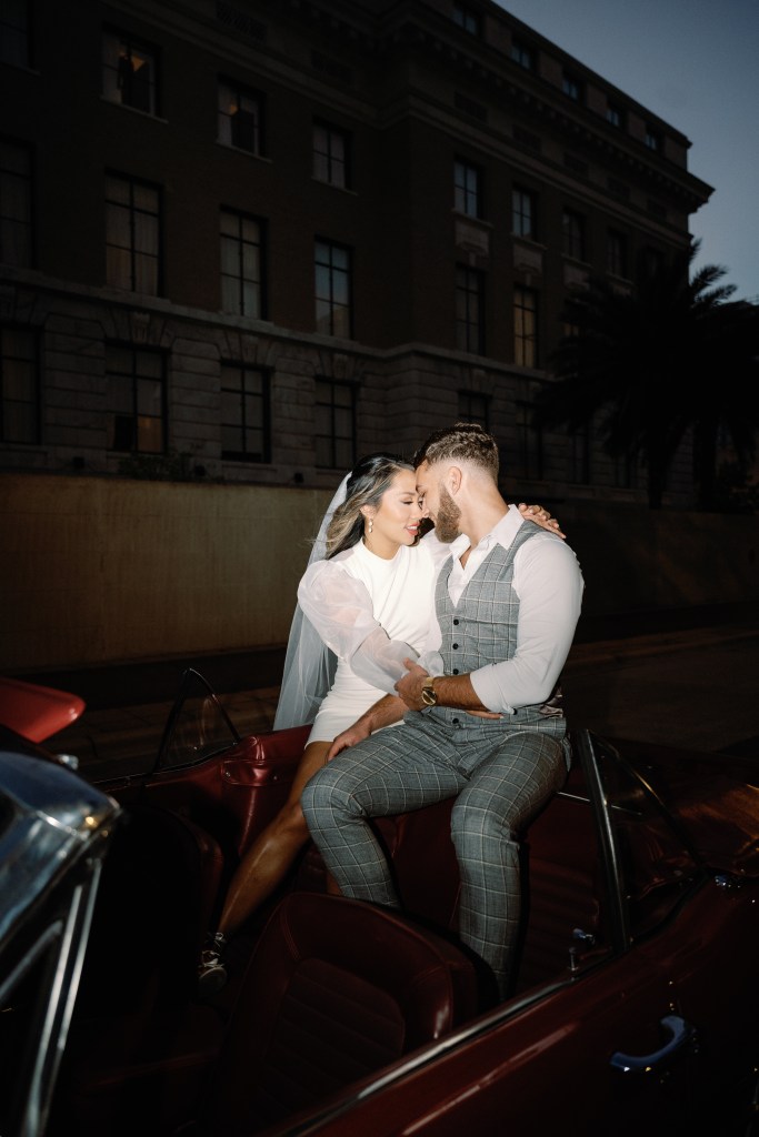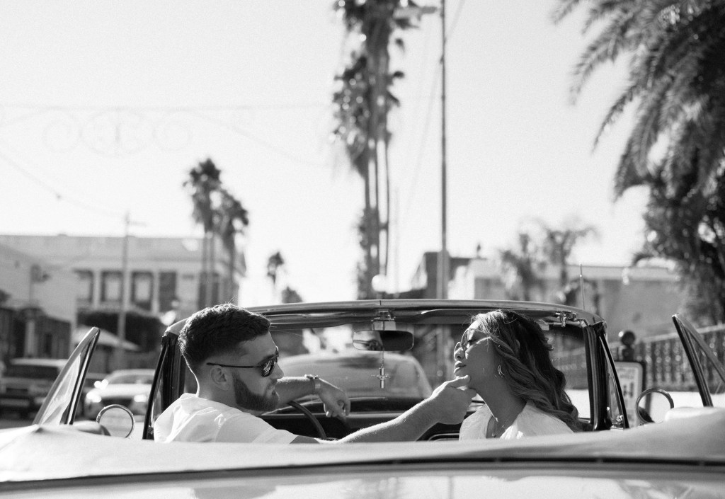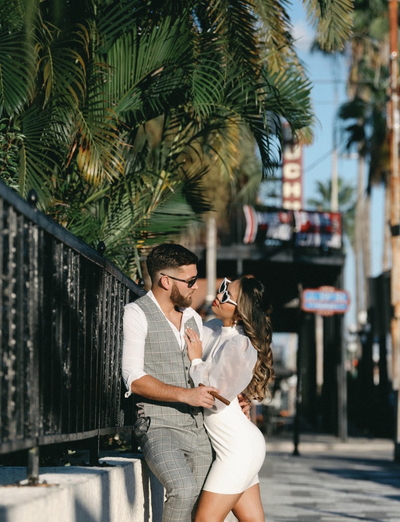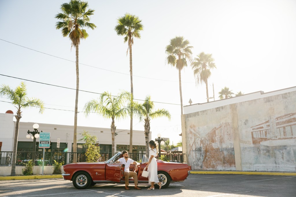 We were going for a retro, old Florida style engagement shoot that looked like we were eloping. I’m talking full paparazzi vibes like we were leaving all of our problems behind, Bonnie and Clyde, and running off together into the sunset. Our photographer, Dewitt for Love Photography, understood the assignment. The first location is giving California or Havana vibes in Ybor, and the second in downtown Tampa looks like NYC. I love that we were able to get our photos to look like they were taken in such different places, but still be right here in Tampa.