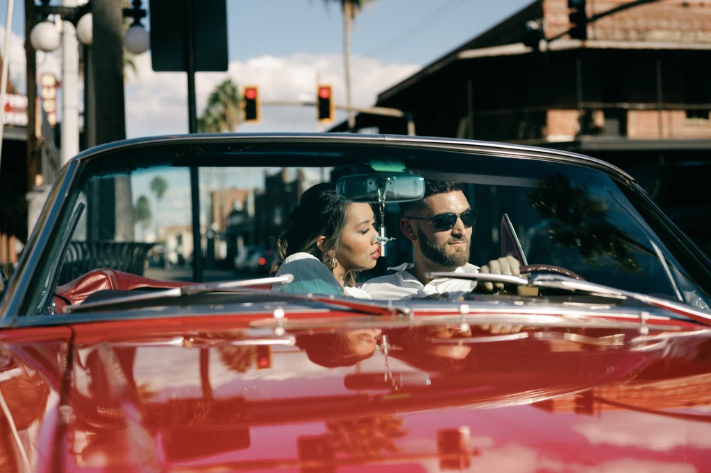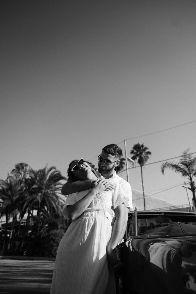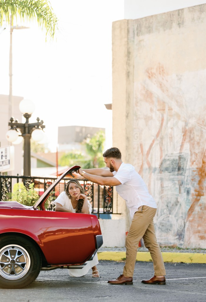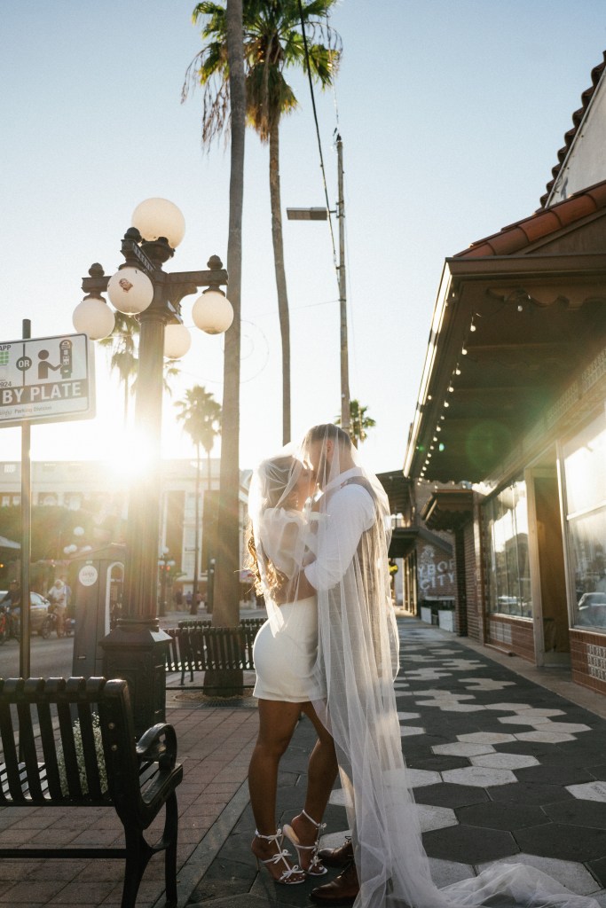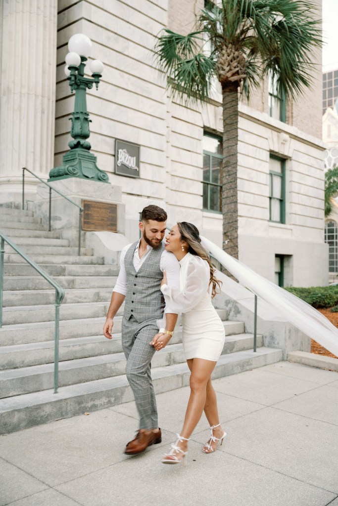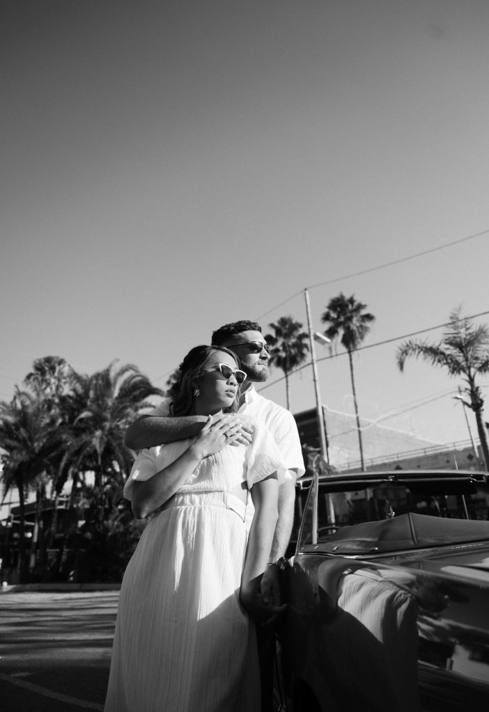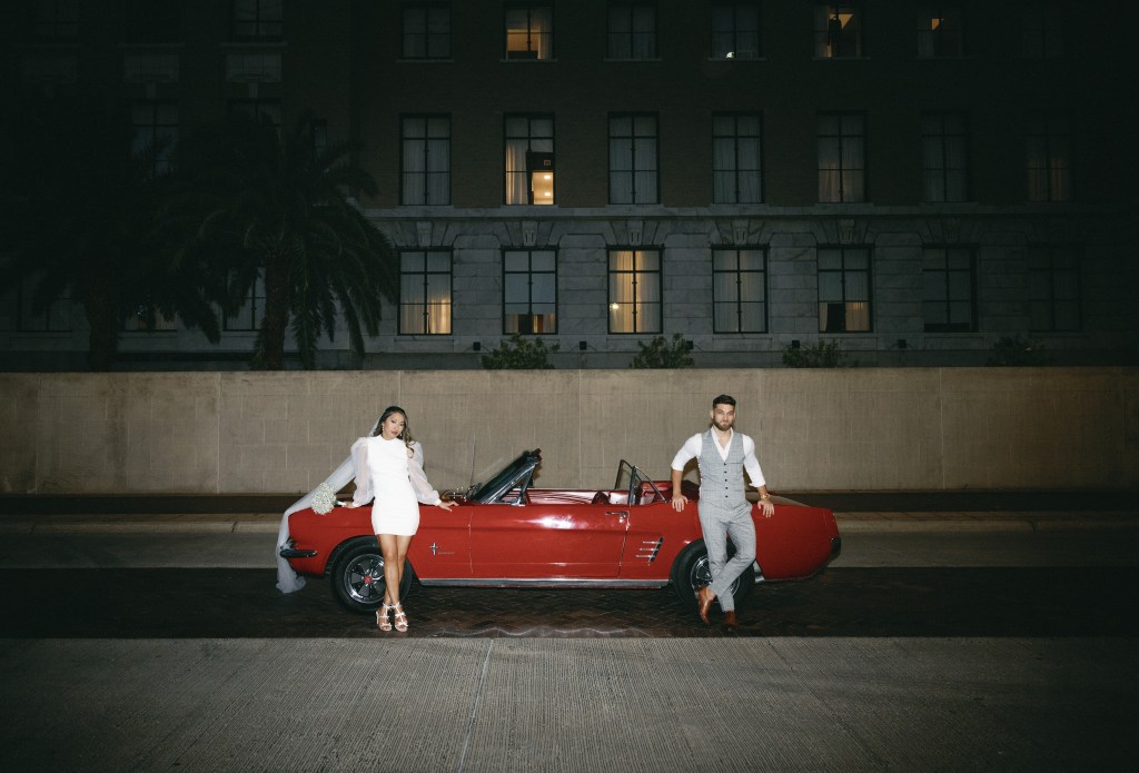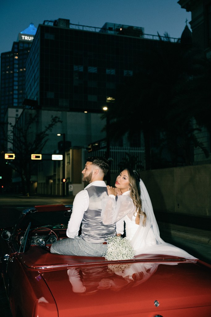 We were going for a retro, old Florida style engagement shoot that looked like we were eloping. I’m talking full paparazzi vibes like we were leaving all of our problems behind, Bonnie and Clyde, and running off together into the sunset. Our photographer, Dewitt for Love Photography, understood the assignment. The first location is giving California or Havana vibes in Ybor, and the second in downtown Tampa looks like NYC. I love that we were able to get our photos to look like they were taken in such different places, but still be right here in Tampa.