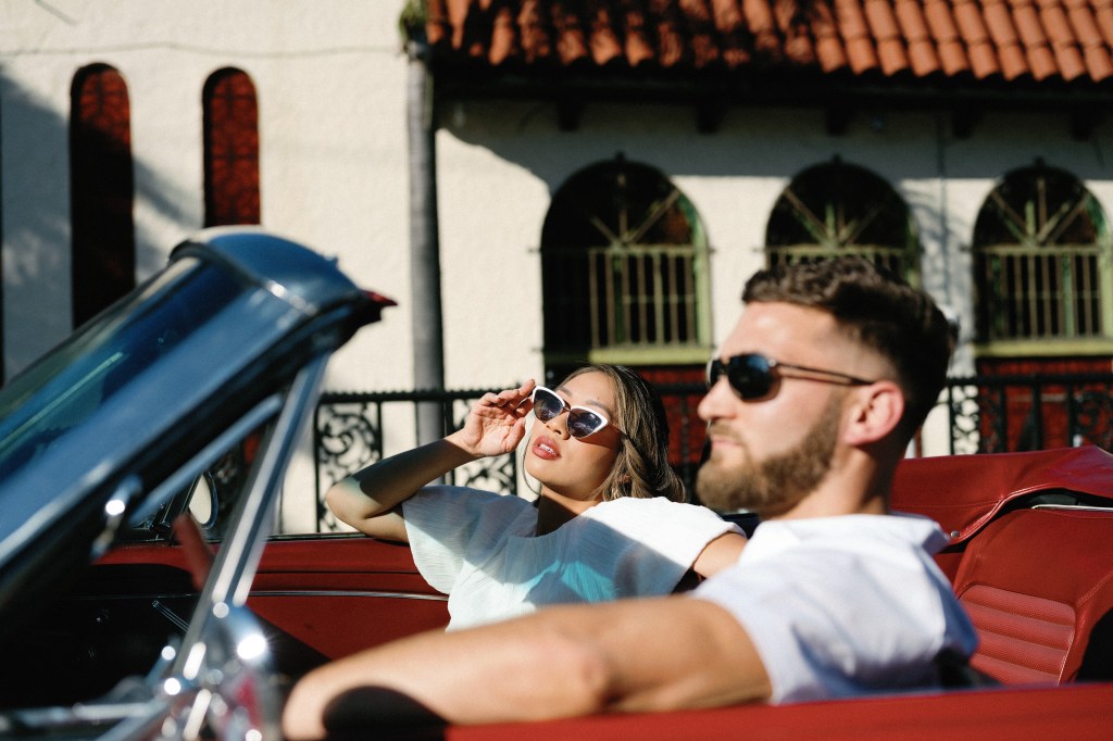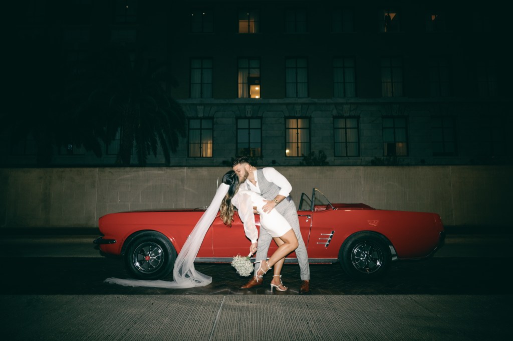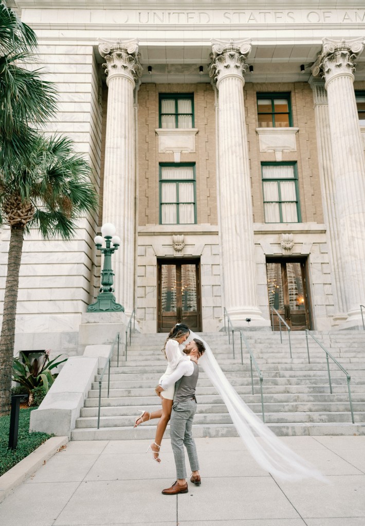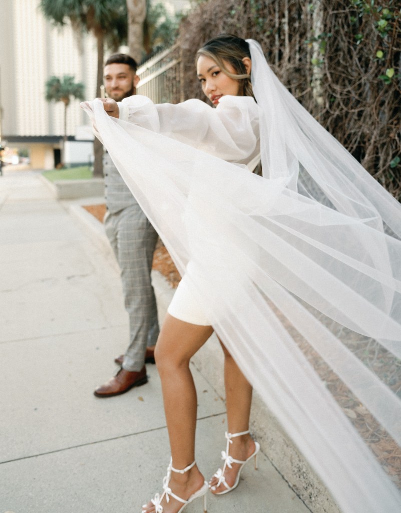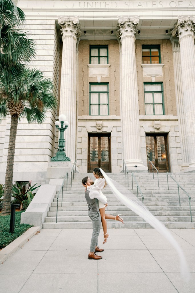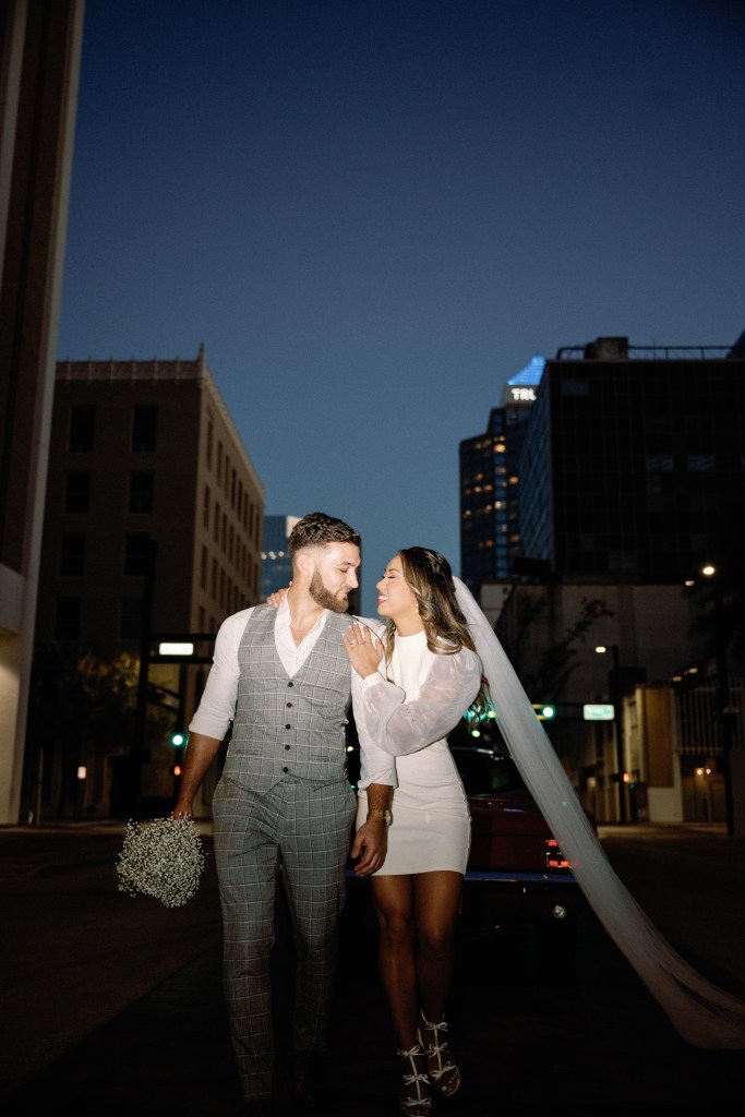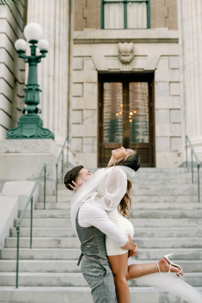 We were going for a retro, old Florida style engagement shoot that looked like we were eloping. I’m talking full paparazzi vibes like we were leaving all of our problems behind, Bonnie and Clyde, and running off together into the sunset. Our photographer, Dewitt for Love Photography, understood the assignment. The first location is giving California or Havana vibes in Ybor, and the second in downtown Tampa looks like NYC. I love that we were able to get our photos to look like they were taken in such different places, but still be right here in Tampa.