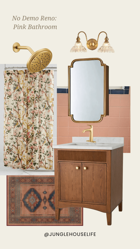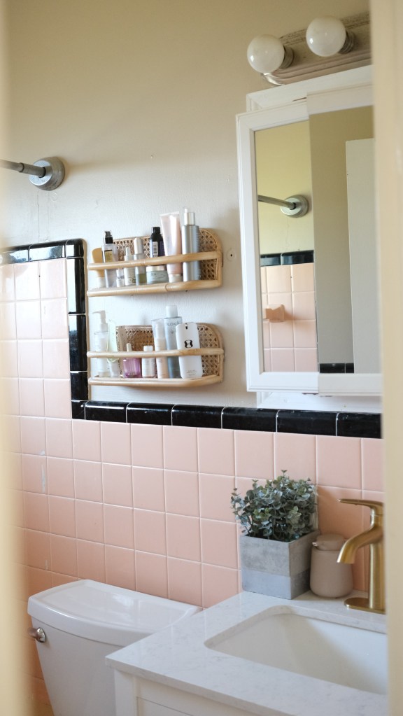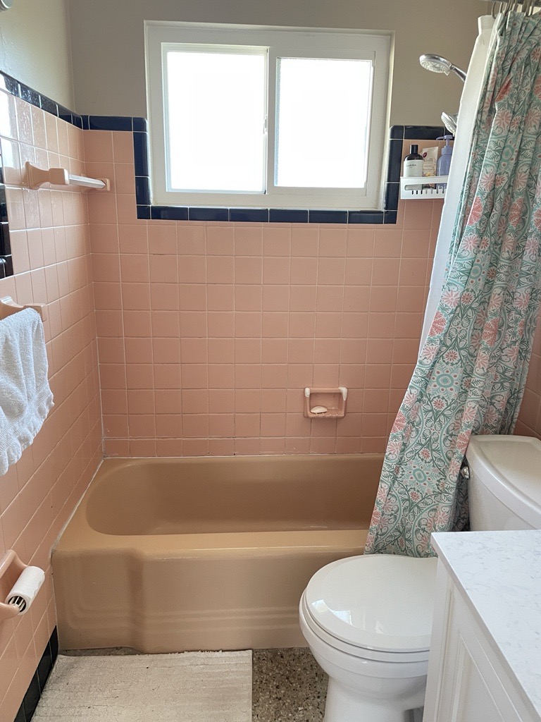 After going back and forth about whether or not to save our 1950’s pink bathroom or completely demo it, we’re now determined to save it! Since moving in 3 years ago, we didn’t do much to the bathroom other than replacing the vanity and toilet. Otherwise, the bathroom was totally original to the house. Unfortunately, the faucets in the bathtub had been severely neglected and plumbing degraded so we will need to replace some of the valves. The tiles are in pretty good condition except for a couple of the tiles having hairline cracks, chips where a shower door used to be and missing toothbrush and soap dishes by the vanity.